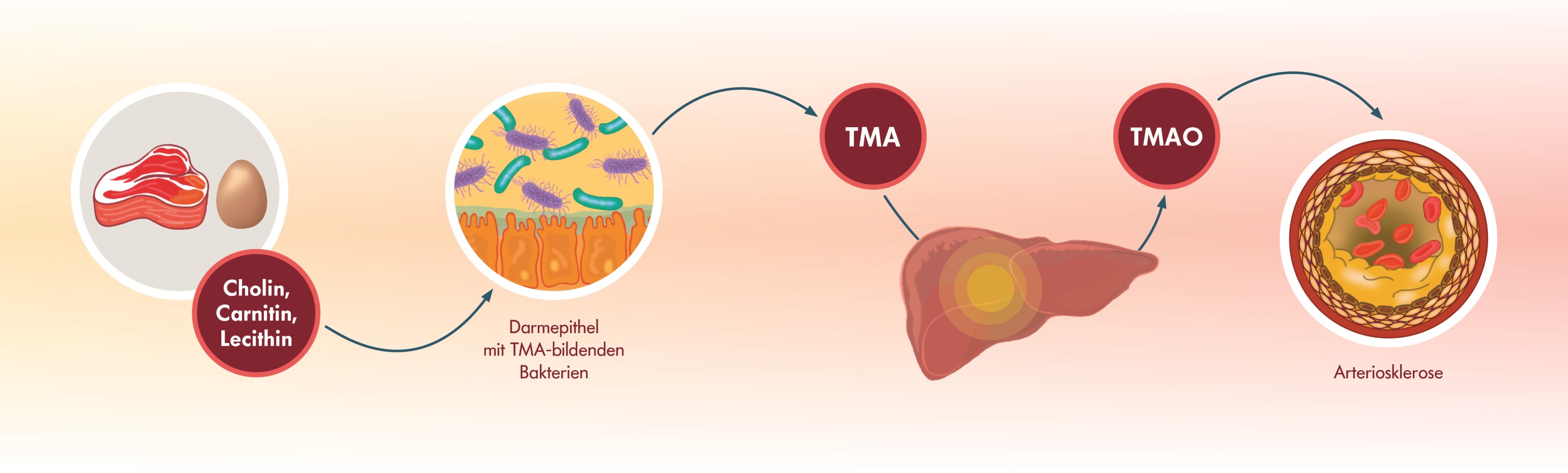 Einige Darmbakterien setzen Cholin, Carnitin und Lecithin zu Trimethylamin (TMA) um. Cholin, Carnitin und Lecithin sind zum Beispiel in Fleisch oder Eiern, aber auch in Nahrungsergänzungsmitteln für den Muskelaufbau enthalten.