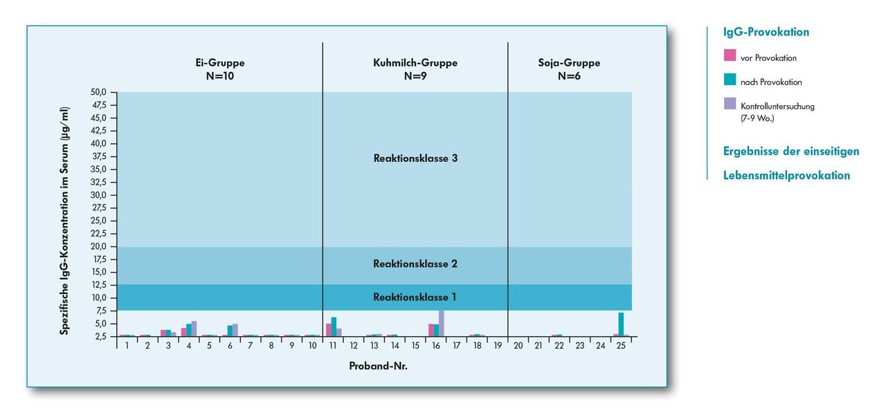 Durch eine einseitige, unphysiologische Provokationsdiät ließen sich bei den 25 gesunden (Lebensmittelallergien im Vorhinein ausgeschlossen) Teilnehmern keine erhöhten IgG-Titer gegen die jeweiligen Lebensmittel auslösen. Dies legt den Schluss nahe, dass hohe IgG-Titer gegen bestimmte Lebensmittel unabhängig vom Ernährungszustand des Patienten auftreten und keine physiologische Antwort auf bestimmte Ernährungsgewohnheiten sein können.