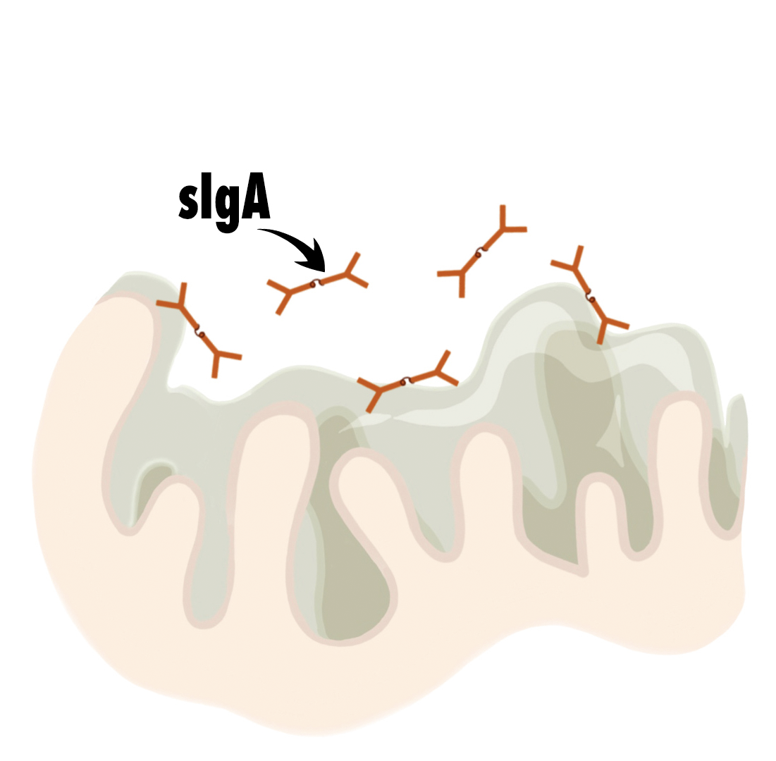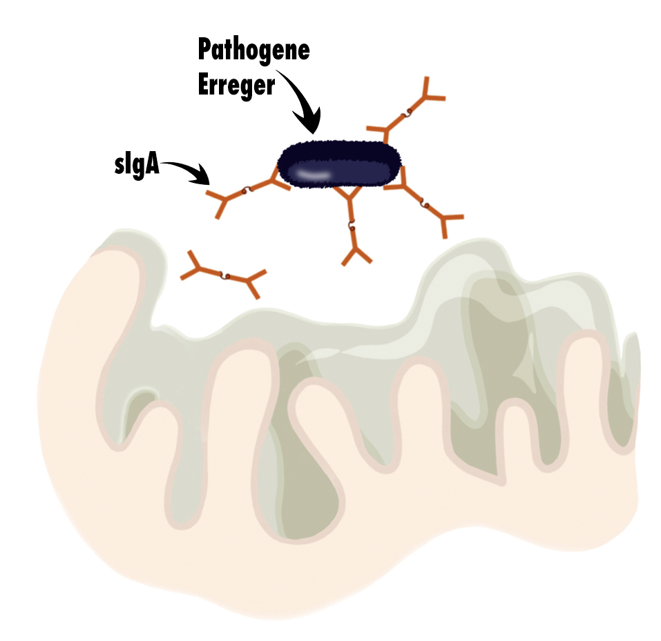 Befindet sich ausreichend sekretorisches IgA an der Schleimhaut und im Lumen, können sich Krankheitserreger nicht an die Schleimhaut anheften und vermehren. Zum Teil bindet das sIgA auch an die natürliche Mikrobiota, möglicherweise um ihre Zusammensetzung zu beeinflussen5.