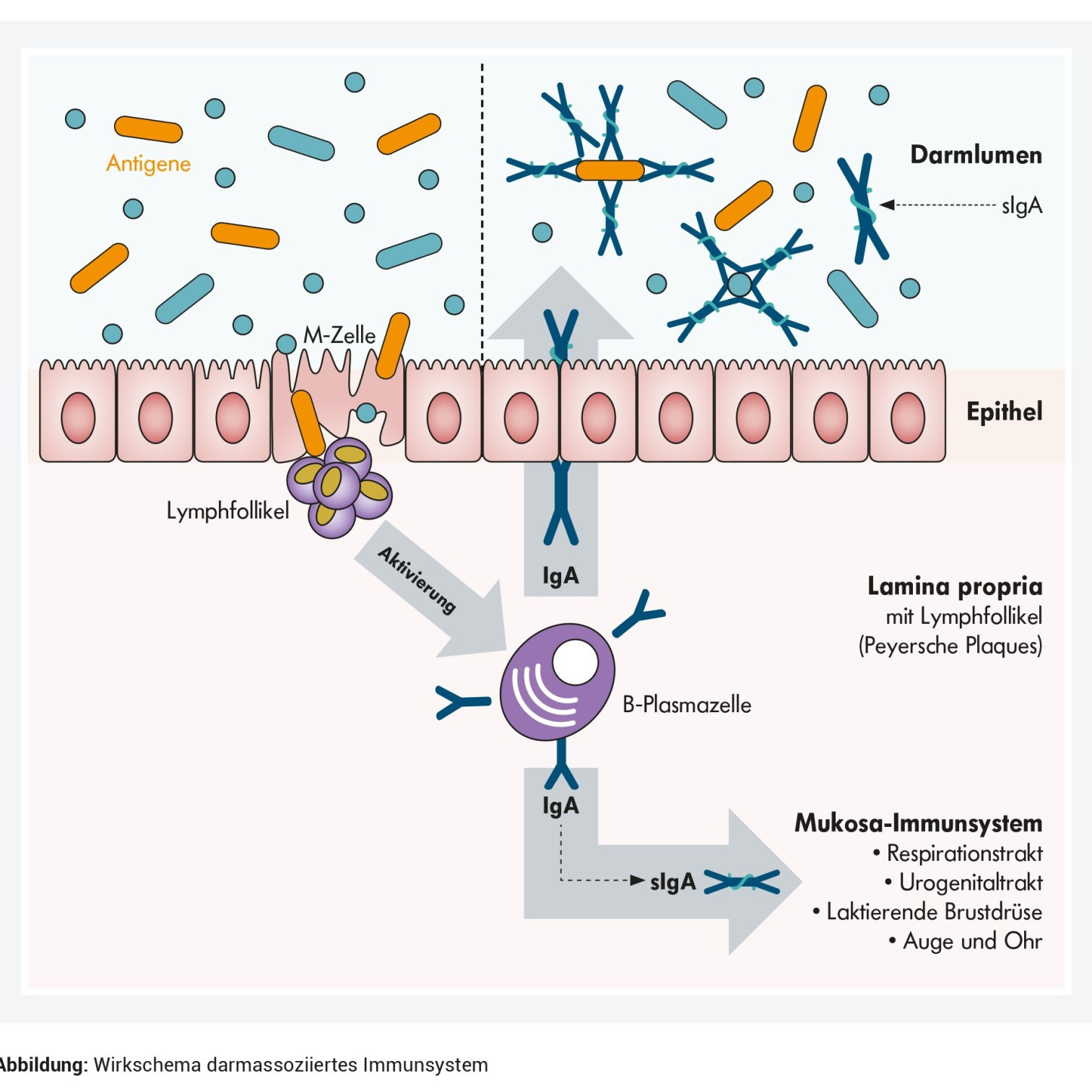 Mit dem sekretorischen IgA beteiligt sich das adaptive Immunsystem am Schleimhaut-Schutz: Bei Gesunden regen Antigene wie Bakterien oder Nahrungsbestandteile die Bildung des IgA in den B-Zellen an. Die M-Zellen der Darmschleimhaut transportieren dafür Antigene durch das Epithel zum darunterliegenden Lymphgewebe. Oder spezialisierte dendritische Zellen „greifen“ zwischen den Epithelzellen hindurch und "nehmen Proben" aus dem Lumen. Das regt die Entwicklung IgA-bildender B-Plasmazellen an (1,2). Die dendritischen Zellen bilden zusätzlich das Enyzm Stickoxidsynthase, das die B-Plasmazellen umprogrammiert. In der Folge produzieren sie später IgA - statt anderer Antikörperklassen (3). Das IgA macht mit etwa 15 Prozent einen bedeutenden Anteil aller Immunglobuline im Körper aus (4).