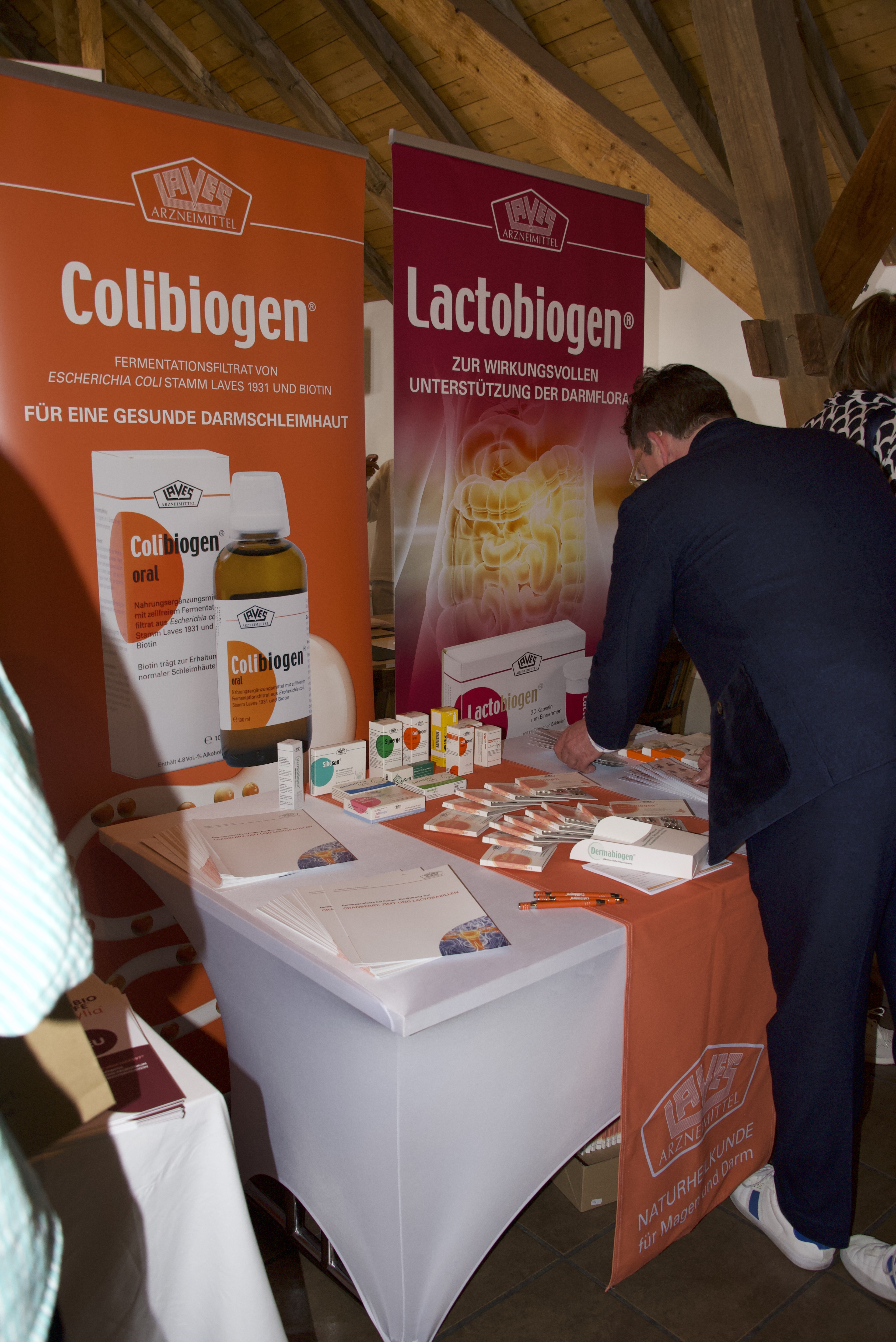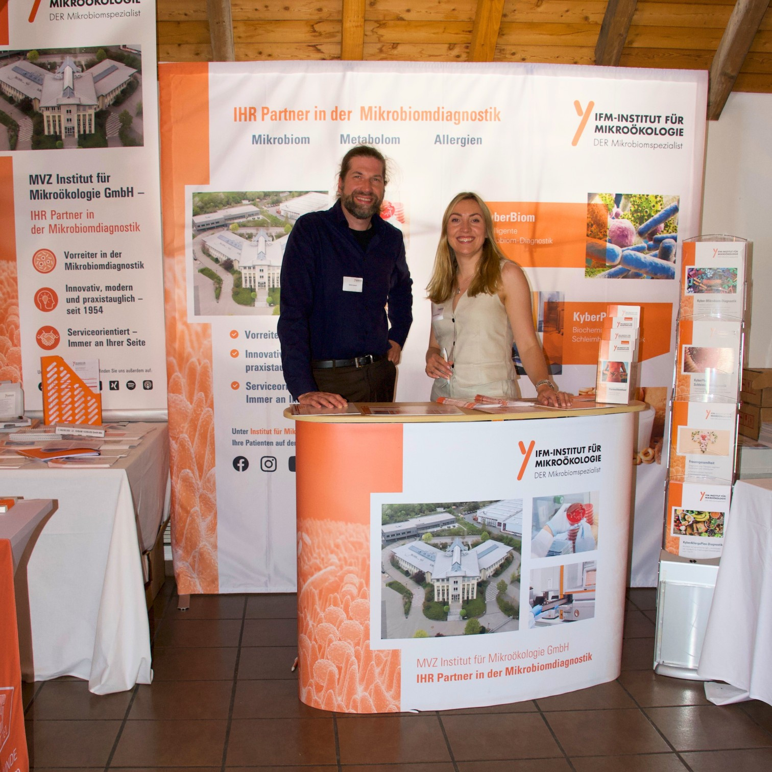 Am Samstagmorgen begrüßte Prof. Dr. rer. nat. Andreas Schwiertz alle Teilnehmenden mit einer kurzen Einführung in das Thema und das diesjährige Programm. Er stellte zudem die Aussteller der kleinen Industriemesse vor. Hier hatten die Teilnehmenden die Möglichkeit sich über probiotische Produkte und die Mikrobiomdiagnostik zu informieren. Kemja Metz und Malte Burkert vom IfM-Außendienst betreute den IfM-Stand vor Ort.