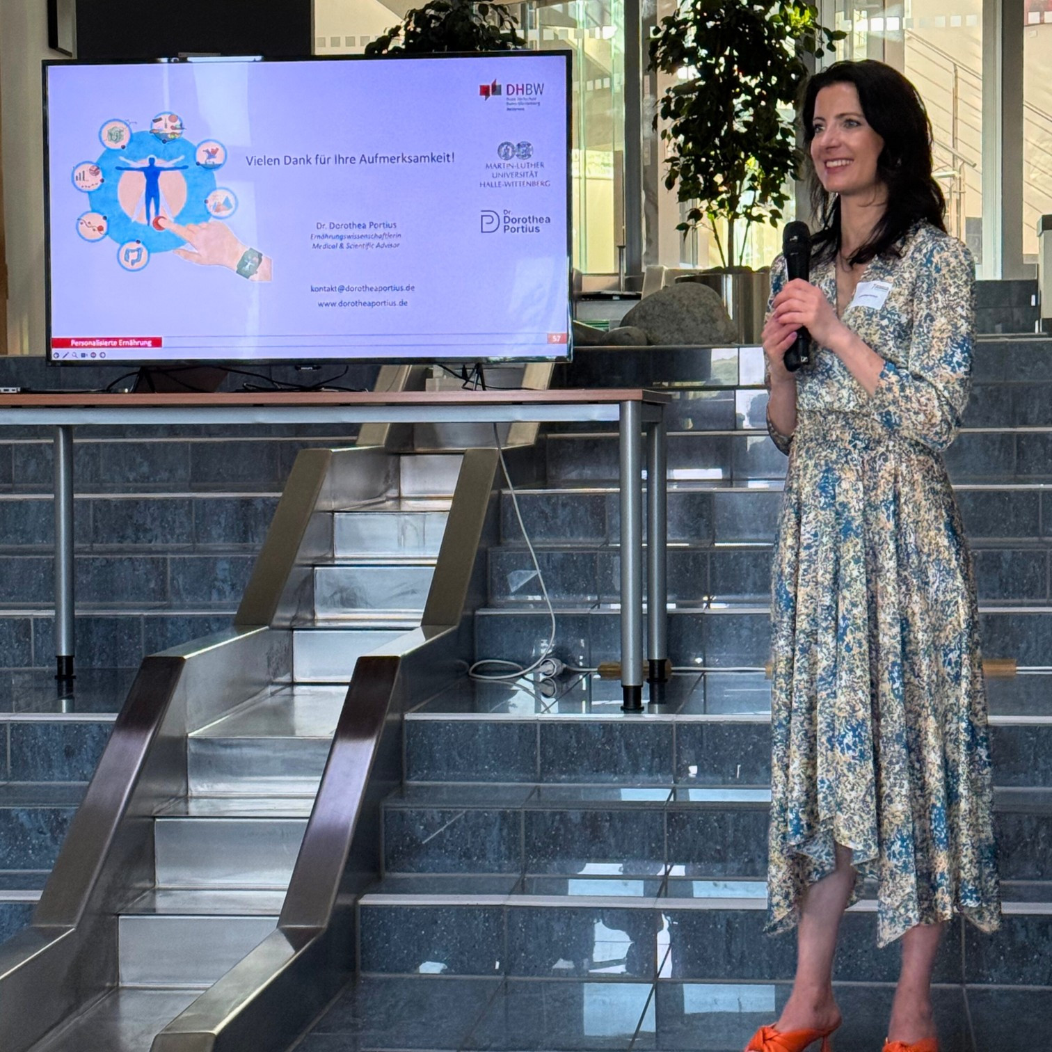 Die Ernährungswissenschaftlerin Dr. rer. nat. Dorothea Portius eröffnete die Herborner Mikrobiom Tage am Freitagabend mit einem Impulsvortrag zum Thema "Im Takt des Lebens: Zyklusbewusste Ernährung und ein integrativer Ansatz für die Frauengesundheit". Dr. rer. nat. Dorothea Portius vereint umfassende Expertise in Ernährungswissenschaft und Forschung mit praktischer Erfahrung im Gesundheitssektor. Ihre akademische Laufbahn begann mit einer Promotion an der Universität Genf, gefolgt von vertiefenden Forschungsprojekten in San Diego, USA. Derzeit ist sie als Habilitandin und Forscherin an der Martin-Luther-Universität Halle-Wittenberg tätig sowie an der Dualen Hochschule Baden-Württemberg Heilbronn. Ebenso berät sie als Medical & Scientific Advisor diverse Firmen und Start-Ups in der Gesundheitsbranche. Durch ihre Arbeit in verschiedenen Fachgremien, wie dem Beirat der Deutschen Adipositas-Gesellschaft (DAG) und der Deutschen Gesellschaft für Ernährungspsychologie (DGEP), leistet sie wichtige Beiträge zu zentralen Diskursen im Gesundheitswesen. Ihr Engagement für die Wissensvermittlung zeigt sich nicht nur in fachlichen Publikationen und Büchern, sondern auch in ihrer Rolle als Ernährungsexpertin für den MDR und das ARD.
