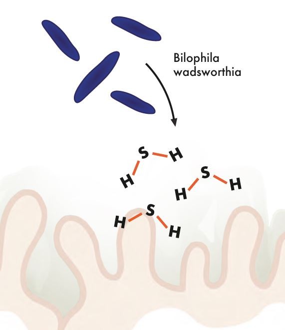 Bilophila wadsworthia produziert das Gas Schwefelwasserstoff (H2S). In niedrigen Konzentration stabilisiert und schützt endogen gebildetes H2S die Darmbarriere. Wird es jedoch in größeren Mengen durch Bilophila wadsworthia gebildet, so baut es Disulfidbrücken im Mukus ab und zerstört somit die Darmintegrität. H2S führt außerdem zu einem Abbau des intestinalen Biofilms und verursacht Entzündungen. Dadurch werden chronisch-entzündliche Erkrankungen und Krebs gefördert.