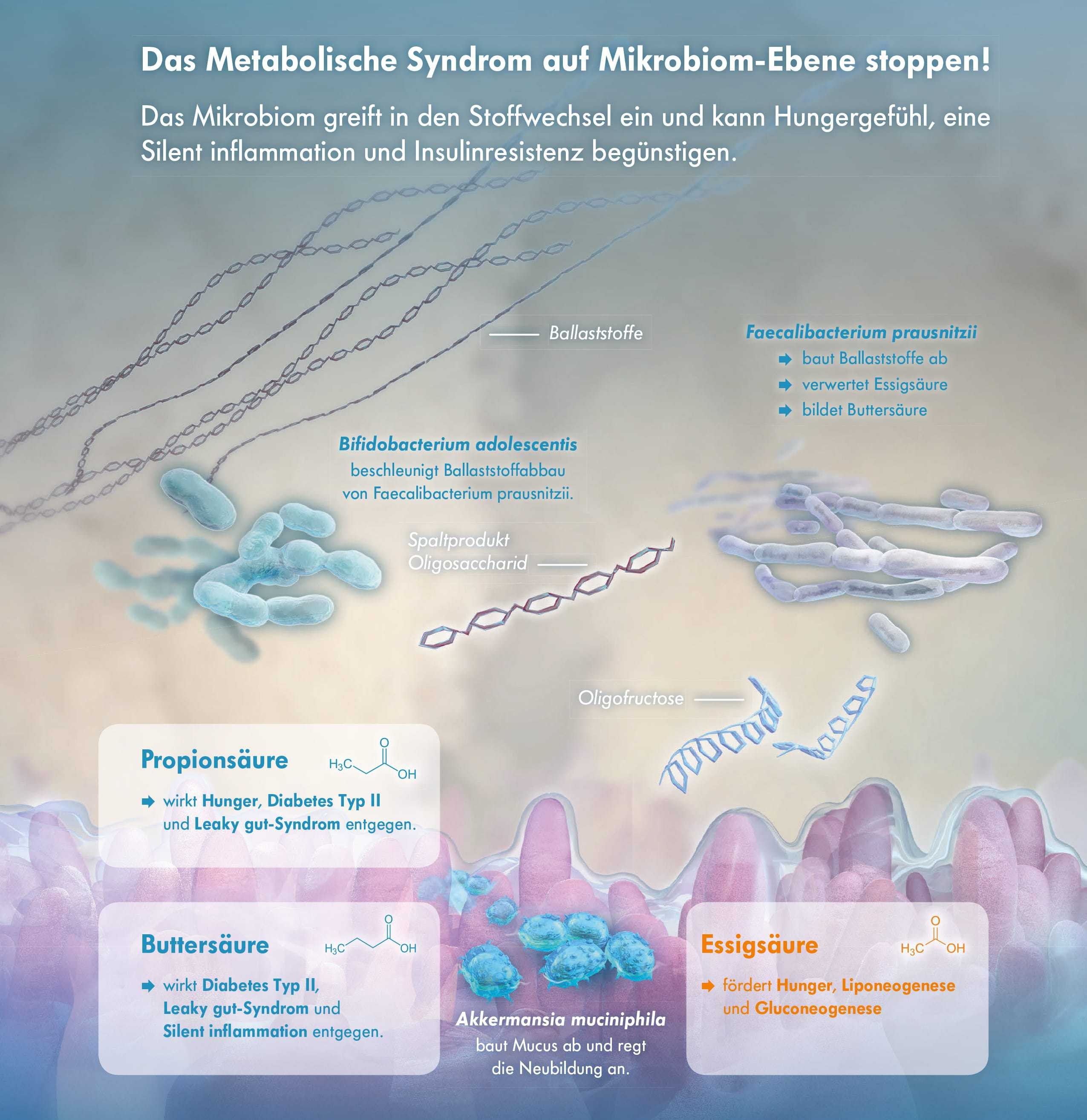Beim Metabolischen Syndrom entgleist der Stoffwechsel des Patienten. Die intestinale Mikrobiota und ihre Produkte spielen dabei eine wichtige Rolle, denn sie beeinflussen den menschlichen Stoffwechsel, die Durchlässigkeit der Darmschleimhaut und das Ausmaß einer metabolischen Endotoxinämie.