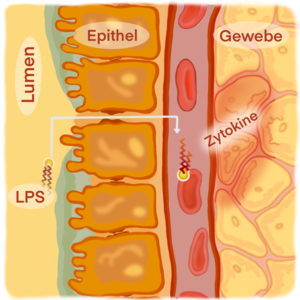 Das LPS ist Bestandteil der Zellwand gram-negativer Bakterien. Sterben die Bakterien ab, wird das LPS - auch als Endotoxin bekannt - aus der Zellwand freigesetzt. Für einen erhöhten LPS-Einstrom in den Blutkreislauf können eine Dysbiose der intestinalen Mikrobiota, dentale Plaques und eine erhöhte Permeabilität der Darmschleimhaut verantwortlich sein. Eine unphysiologisch durchlässige Darmschleimhaut wird auch als Leaky-Gut-Syndrom bezeichnet.