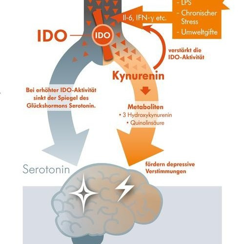 Der Tryptophan-Stoffwechsel mit seinen Metaboliten Serotonin und Kynurenin stellt dabei das Bindeglied zwischen körperlichen und psychischen Beschwerden dar. Eine hohe IDO-Aktivität verschiebt den Tryptophan-Stoffwechsel in Richtung Kynurenin, der Tryptophan-Spiegel sinkt. So entsteht ein Serotonin-Mangel, da mit dem Tryptophan der Ausgangsstoff für die Synthese fehlt. Das kann depressive Verstimmungen und Schlafstörungen fördern. Der Körper nutzt die essentielle Aminosäure Tryptophan für ganz unterschiedliche Zwecke. Den überwiegenden Teil des Tryptophans aus der Nahrung baut er in der Leber ab, um daraus das Coenzym NAD+ zu produzieren, das für viele energieverbrauchende Prozesse essenziell ist. Nur etwa ein Prozent des Tryptophans geht in die Proteinbiosynthese. Aus weiteren drei Prozent stellt der Körper das Glückshormon Serotonin her – zum Teil im Darm und zum Teil im Gehirn. Im Gehirn hat Serotonin die bekannte schmerzhemmende, entspannende und stimmungsaufhellende Wirkung; gleichzeitig ist es Ausgangsstoff für das schlaffördernde Melatonin. Aber auch im Darm ist Serotonin wichtig: Es beeinflusst die Motilität, die Schleimsekretion und das Schmerzempfinden.
