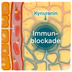 Ein Zuviel an Kynurenin kann jedoch eine Immunblockade verursachen, bei der Vermehrung und Apoptose der Killerzellen zurückgehen. Der erhöhte Kynurenin-Spiegel verschiebt die Immunbalance in Richtung Immuntoleranz: mehr TReg (früher „Suppressorzellen“) und weniger zytotoxische T-Zellen.