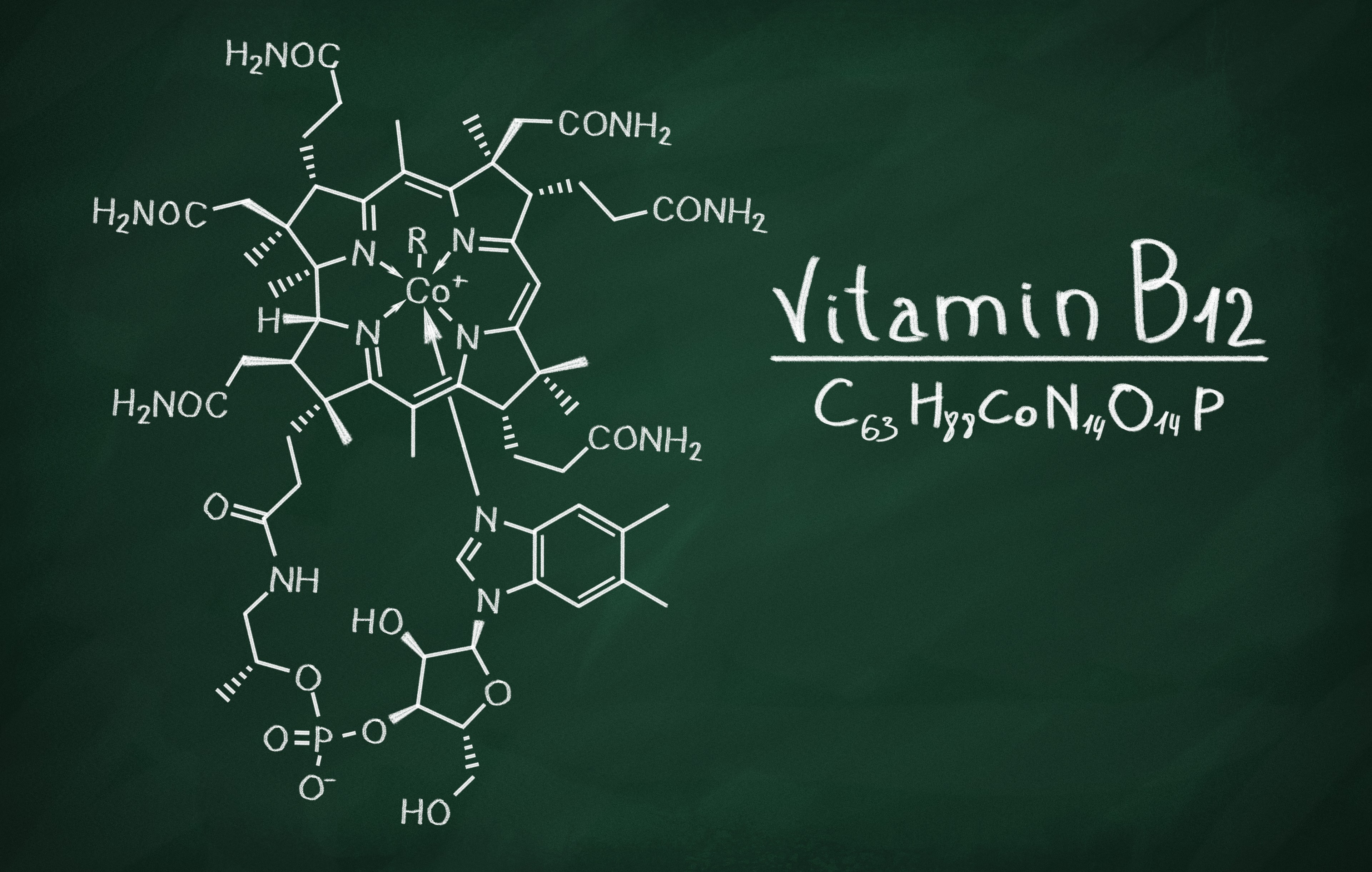 Bei Vitamin B12 – oder Cobalamin – handelt es sich um eine Gruppe von Verbindungen aus einem Corrin-Ringsystem und einem zentralen Kobalt-Ion.