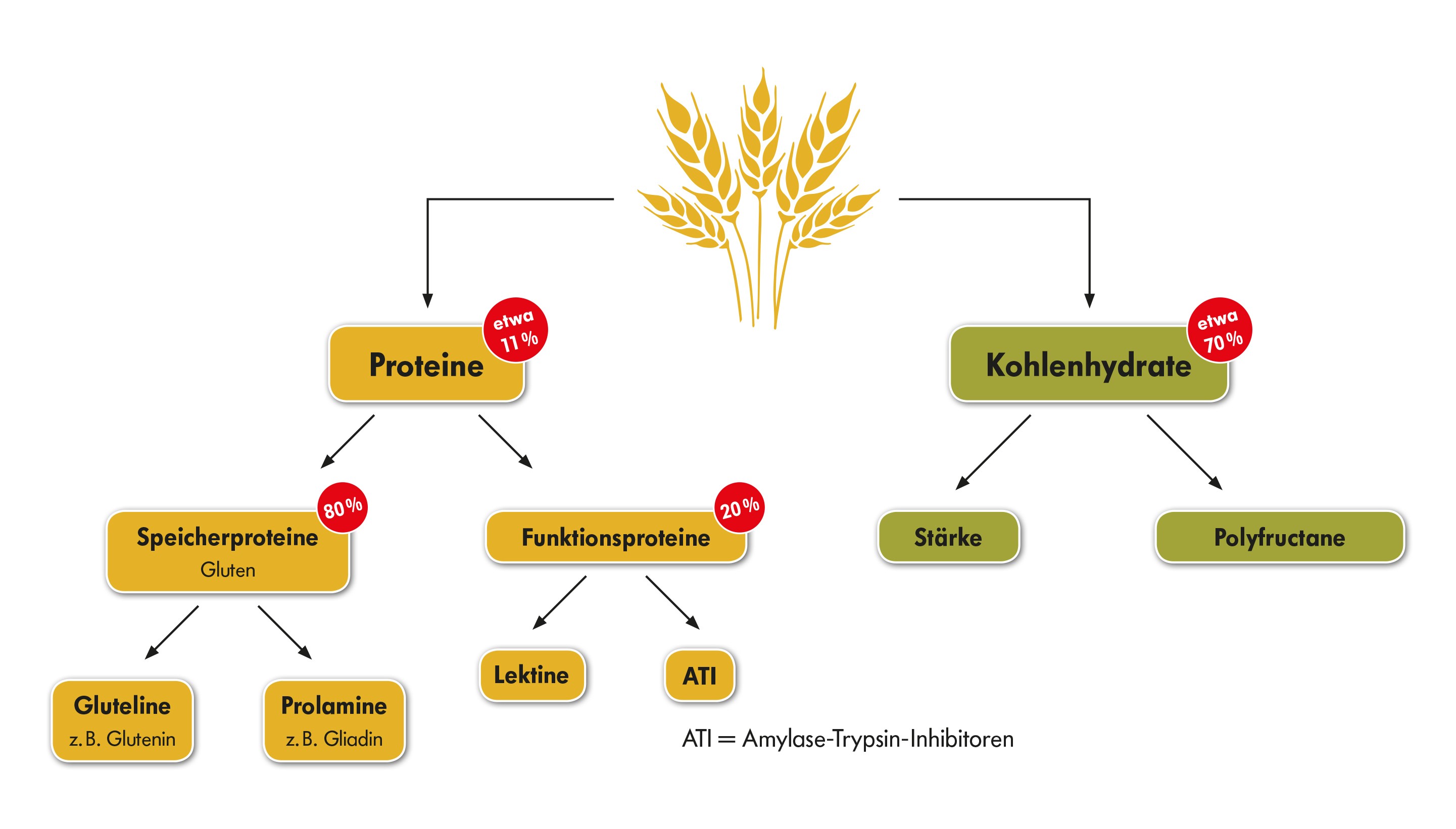 Gluten ist ein Eiweißgemisch in verschiedenen Getreidesorten, das aus Prolaminen und Glutelinen besteht. Bei der Zöliakie lösen die Prolamine die Erkrankung aus. Je nach Getreidesorte tragen die Prolamine unterschiedliche Namen, da sie sich leicht voneinander unterscheiden: